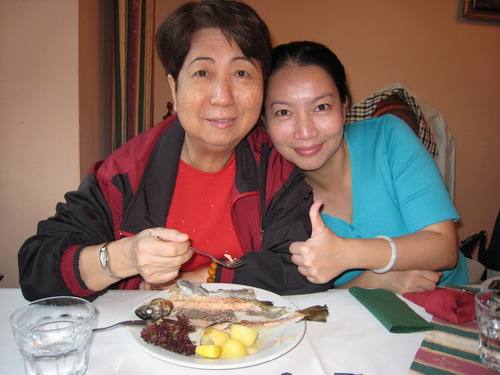 這是2007年我們到東歐時吃魚的照片,當天晚上的晚餐是一條鱒魚,許多人不知從何下手,所以根本沒吃完,本著澎湖人的氣魄,我戰勝了從小被魚骨頭噎怕了的恐懼,有頭有尾但有些凌亂的吃完了那條魚。但是,強者出現了,什麼叫做會吃魚?我家老媽應該當之無愧了,連二姊都要在旁邊當見證人。